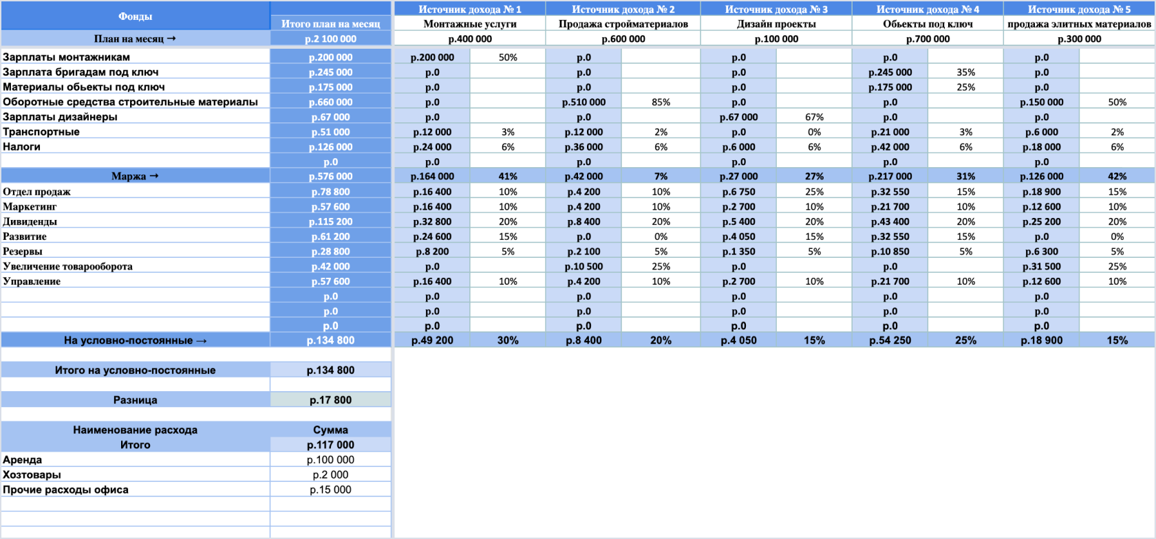 для компании, на основе аналитики, с учётом дивидендов, развития, маркетинга и резервов